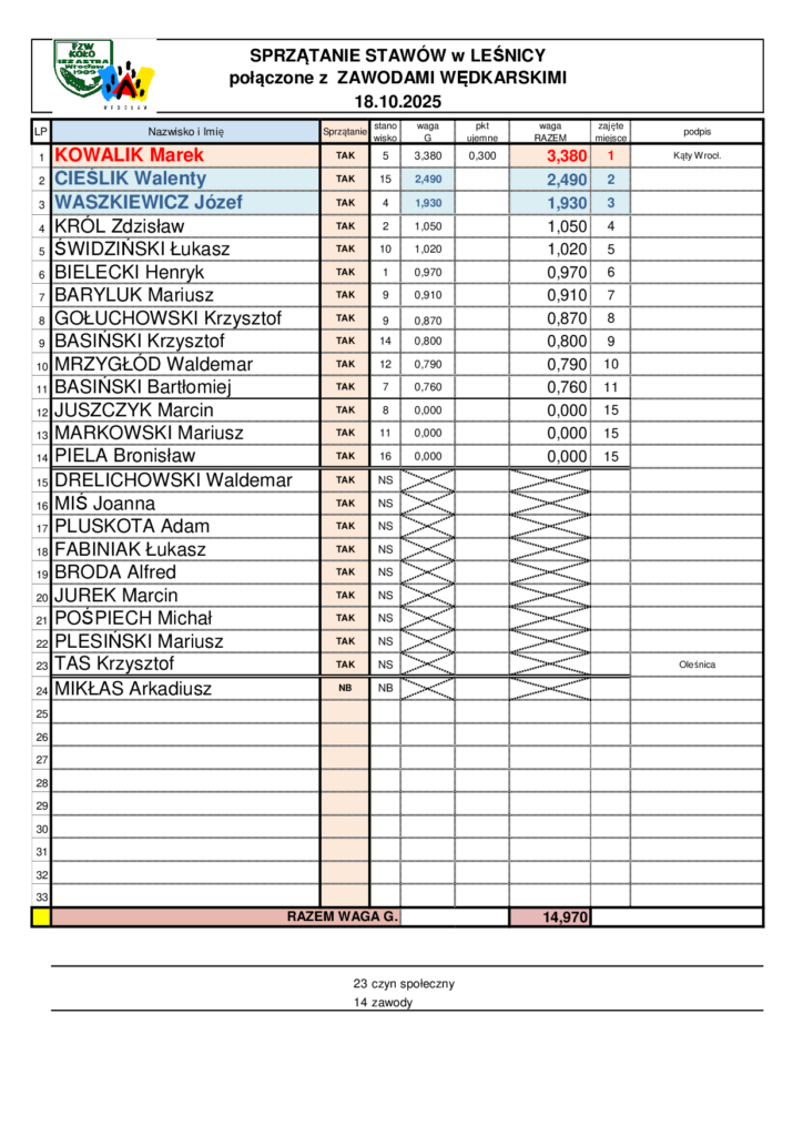 wyniki Sprzątania i Zawodów Wędkarskich 18.10.2025